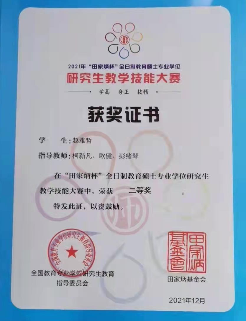 2022年1月7日,由全国教育专业学位研究生教育指导委员会主办、浙江师范大学承办的 “田家炳杯”全日制教育硕士专业学位研究生教学技能大赛通过线上举行。世俱杯官网学科教学(思政)专业研究生赵雅哲众多选手中表现优异荣获二等奖,柯新凡、欧健、彭绪琴三位老师荣获优秀指导教师奖。