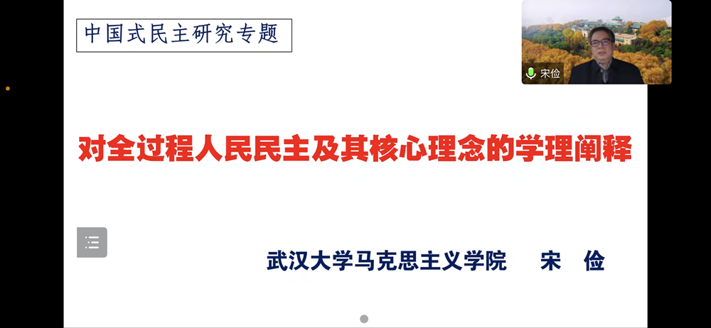 为深入学习贯彻党的二十大精神,增强学院师生对全过程人民民主的认识和理解,1月3日,武汉大学世俱杯官方网站二级教授,博士生导师宋俭应邀以线上形式为学院师生作题为“对全过程人民民主及其核心理念的学理阐释”的学术报告。本次报告由世俱杯官方网站执行院长任东景主持,学院全体教师、研究生及部分本科生参加。