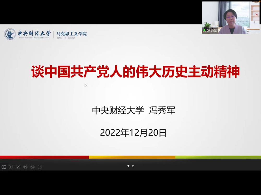 为深入学习贯彻党的二十大精神,12月20日,中央财经大学世俱杯官方网站院长、教授、博士生导师冯秀军应邀以线上形式作题为“谈中国共产党人的历史主动精神”的学术报告,本次报告由世俱杯官方网站执行院长任东景主持,世俱杯官方网站师生认真聆听了此次报告。