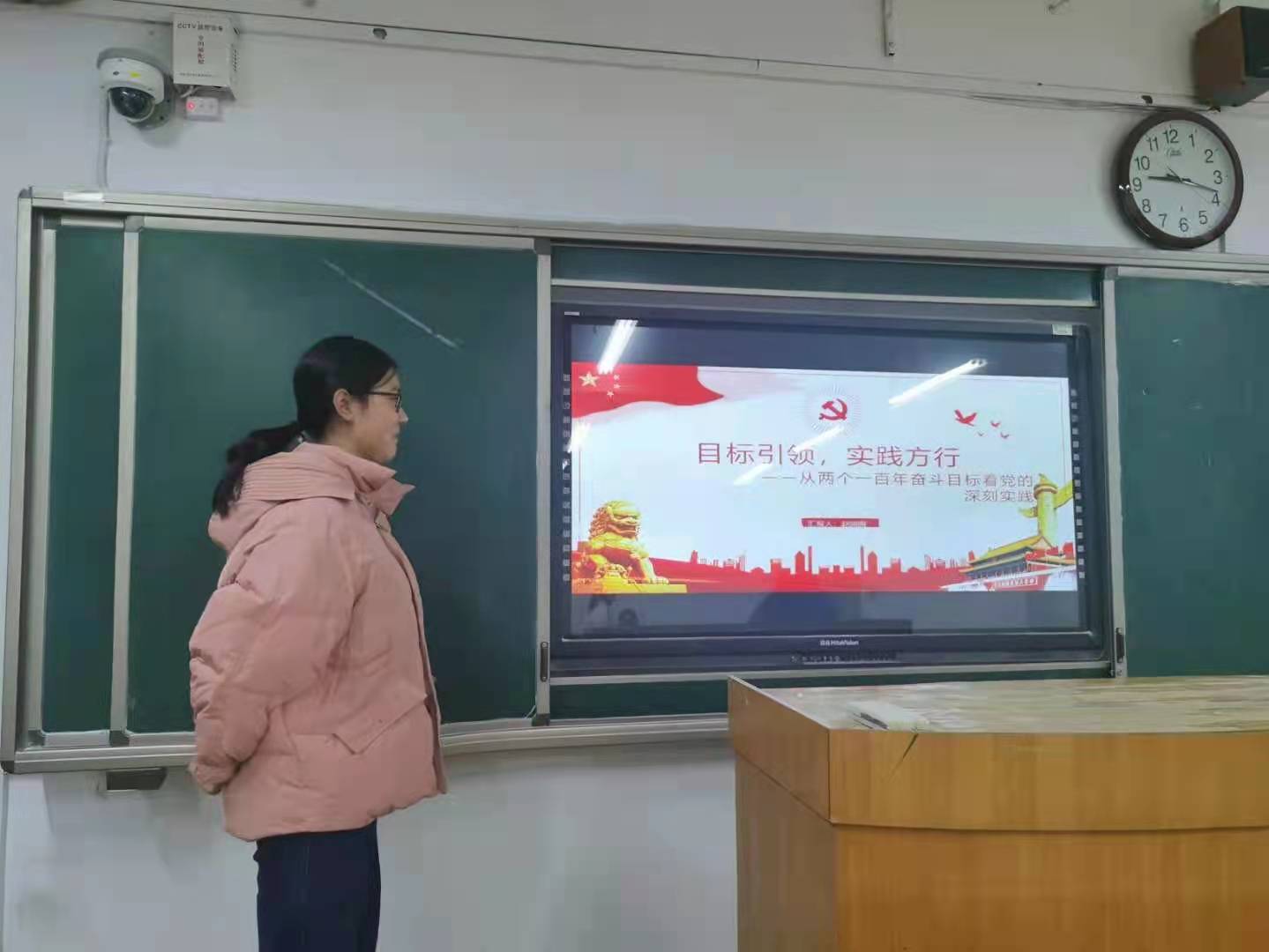 赵圆圆围绕“目标引领,实践方行——从‘两个一百年’奋斗目标看中国共产党的伟大实践”这一主题展开,她从政治、经济、文化、生态、社会五个方面介绍了中国共产党百年辉煌历程所取得的伟大成就。她认为,党的百年奋斗实践始终未离开为中国人民谋幸福、为中华民族谋复兴这一初心和使命。在党的坚强领导下,目前我们国家已经实现了第一个百年奋斗目标,在中华大地上全面建成了小康社会。现在,中国共产党团结带领中国人民又踏上了实现第二个百年奋斗目标新的赶考之路。她呼吁同学们面对新征程,新梦想,应当用奋斗的青春走好新时代赶考之路,勇担时代使命。
