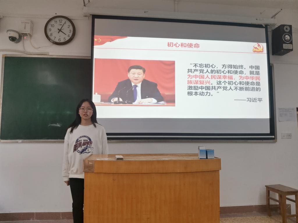 于婷以《绿水青山就是金山银山--美丽中国走起来》为题,围绕良好生态环境是最普惠的民生福祉、保护生态环境就是保护生产力、以系统工程思路抓生态建设、实行最严格的生态环境保护制度四个方面对习近平的绿色发展理念进行宣讲;鲍涵以《人民共和国从这里走来——中华苏维埃共和国史》为题,讲述“中华苏维埃共和国为何定都瑞金”、“为什么说赣南等原中央苏区是我们党最重要的治国理政试验田”、“伟大苏区精神有哪些深刻内涵和历史表现”等重大时代之问,再现了艰苦卓绝的苏区岁月,她表示,让苏区精神历久弥新、永放光芒是我们继往开来、走好中国道路的时代使命;张景雯以《新时代新征程——坚持共产党人的初心和使命》结合张桂梅老师在华坪女子高级中学的教育扶贫阵地坚守共产党人初心使命的故事,向大家讲解中国共产党人初心和使命的内涵,她认为,在新时代,无论是抗击疫情还是抢险救灾,中国共产党员都在用自己的方式践行初心和使命,带领人民创造美好生活,为中华民族民族伟大复兴不懈奋斗。