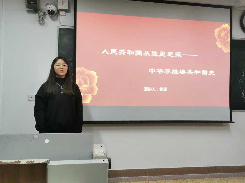为深入学习贯彻习近平新时代中国特色社会主义思想和党的十九届六中全会精神,12月16日晚上,世俱杯官方网站学生党员宣讲团成员2019级于婷、鲍涵和张景雯在综合楼208教室为2019级2班学生开展宣讲活动。