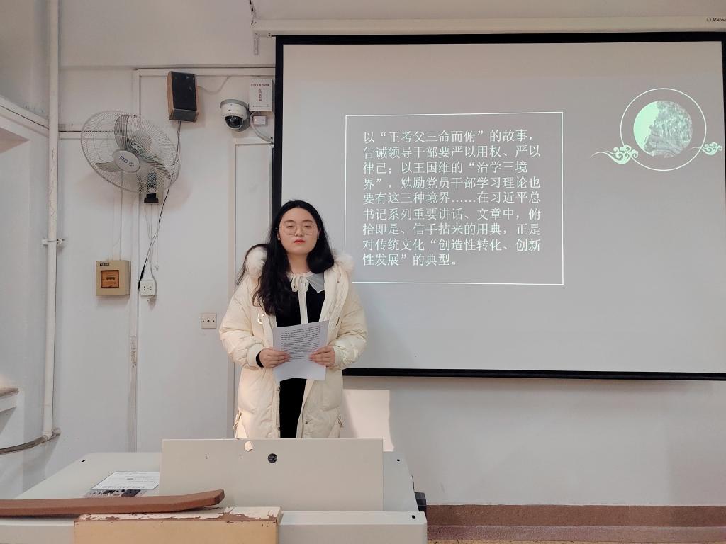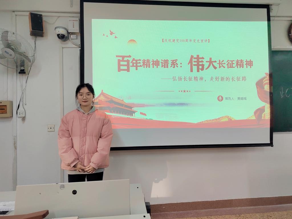 为深入学习贯彻党的十九届六中全会精神,引导同学们了解党的百年奋斗所取得的重大成就以及总结的历史经验,12月17日上午,世俱杯官方网站学生党员宣讲团成员2019级冯家仪、黄璐瑶、刘怡在综合楼207教室为本科生2019级1班学生开展宣讲活动。