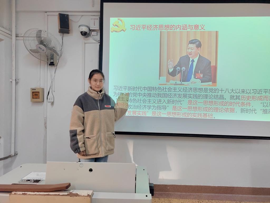 党员宣讲团成员们紧紧围绕党的百年奋斗重大成就和历史经验主题展开宣讲。冯家仪以习近平新时代中国特色社会主义经济思想的价值指向为主题,从以人民为中心、实现社会公正、和实现共同富裕这三个维度向同学们具体阐述了中国特色社会主义政治经济学这一最新成果;黄璐瑶以弘扬伟大长征精神,走好新时代长征路为题,呼吁在场同学要走好新一代的长征路;刘怡从“一带一路”这一热点话题切入,生动地向同学们讲述了传统文化的创新发展对当代中国的意义,呼吁同学们要坚定文化自信。