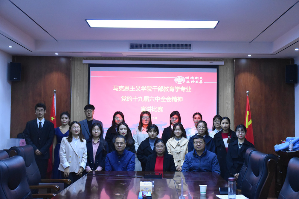 为深入学习贯彻党的十九届六中全会精神,12月5日上午,世俱杯官方网站在学院三楼会议室举办干部教育学专业学习党的十九届六中全会精神宣讲比赛。学院党委副书记吴涛、副院长彭绪琴、思想政治教育系主任郭强应邀出席并担任比赛评委,2021级硕士研究生尚应祥、张鑫担任主持人。