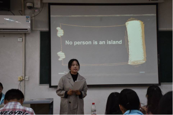 此次演讲比赛以“No person is an island”为主题。在抽签确定演讲顺序之后,各参赛选手围绕主题进行演讲,他们精神饱满,语言流畅,从自身的角度出发表达看法和观点,畅所欲言。其中,牟国宇的表现尤为出彩,他以标准的发音、抑扬顿挫的语调、流利的表达脱颖而出,通过与评委观众的互动活跃了现场气氛,突出了演讲主题。选手们激情澎湃、热情横溢的演讲将比赛一点点推向高潮,现场掌声不断,气氛活跃。