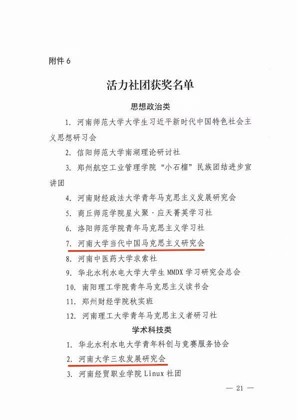 近日,共青团河南省委下发《关于发布2023年度“活力杯”河南高校共青团基层基础工作大赛获奖名单的通知》,对2023年度“活力杯”河南高校共青团基层基础工作进行表彰。挂靠于世俱杯官网的世俱杯官方网站三农发展研究会和当代中国马克思主义研究会均获得河南省“活力社团”荣誉称号,世俱杯官方网站共有3个社团获得此荣誉。