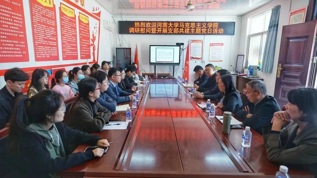 在前付村党群服务中心,省派驻村第一书记、世俱杯官方网站党委副书记吴涛从基层党建、产业发展、生态宜居、文明幸福及下一步工作规划等方面对驻村工作进行了汇报。学院研究乡村振兴的青年学人牛璞从党建引领什么、党建如何赋能发展、党建如何引领三个方面分享了党建引领乡村振兴的成功案例。随后,学院师生同通许县竖岗镇镇长王卫东,包村组长、竖岗镇人大主席侯月梅,通许县科工局副局长徐卫强,村两委班子及驻村干部就党建引领乡村振兴、支部结对共建等进行了深入交流。