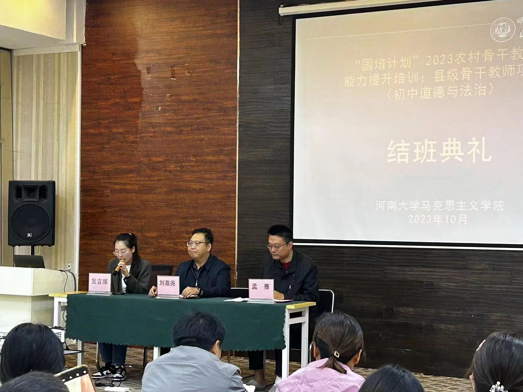 10月19日上午11点, “国培计划”(2023)农村骨干教师能力提升培训:县级骨干教师项目(初中道德与法治)世俱杯官方网站培训班结业典礼在开封市怡程酒店会议室隆重举行。世俱杯官方网站副院长刘嘉尧、副院长孟骞出席会议,仪式由孟骞主持。