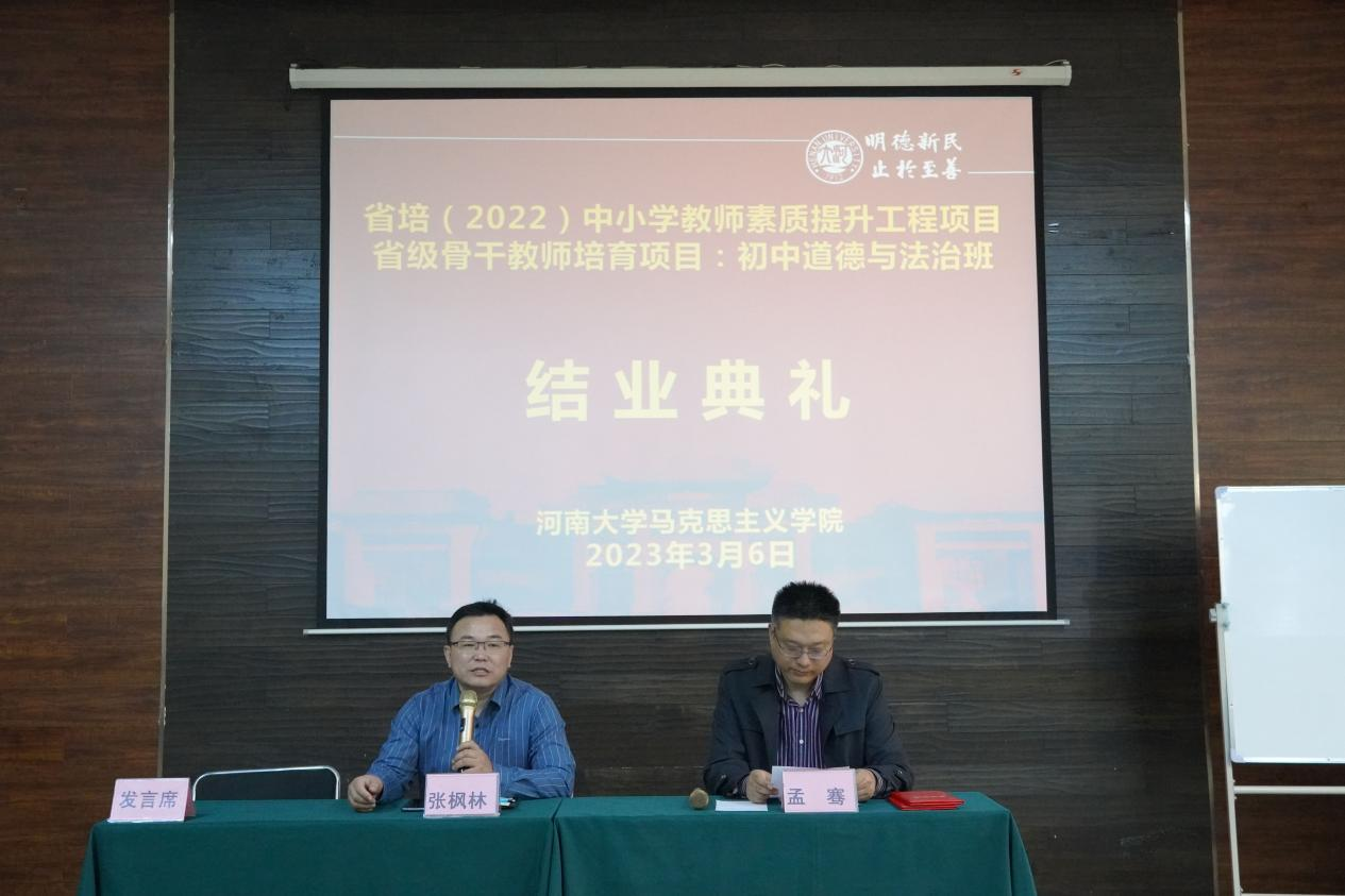 3月6日上午,世俱杯官方网站“省培计划(2022)”义务教育师资薄弱环节暨中小学素质提升工程项目省级骨干教师培育项目(初中道德与法治)结业典礼在开封市怡程酒店会议室举行。世俱杯官方网站副院长张枫林、孟骞出席结业典礼,结业典礼由孟骞主持。