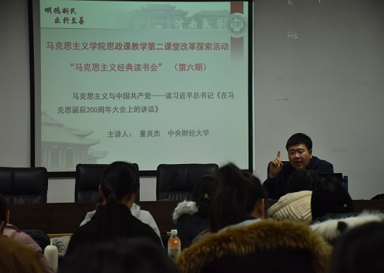 11月24日下午,马克思主义与中国共产党——研读习近平总书记《在纪念马克思诞辰200周年大会上的讲话》读书会于世俱杯官方网站五楼会议室举办。学院特邀中央财经大学世俱杯官方网站副教授董良杰担任主讲嘉宾,各年级学生到场参加。