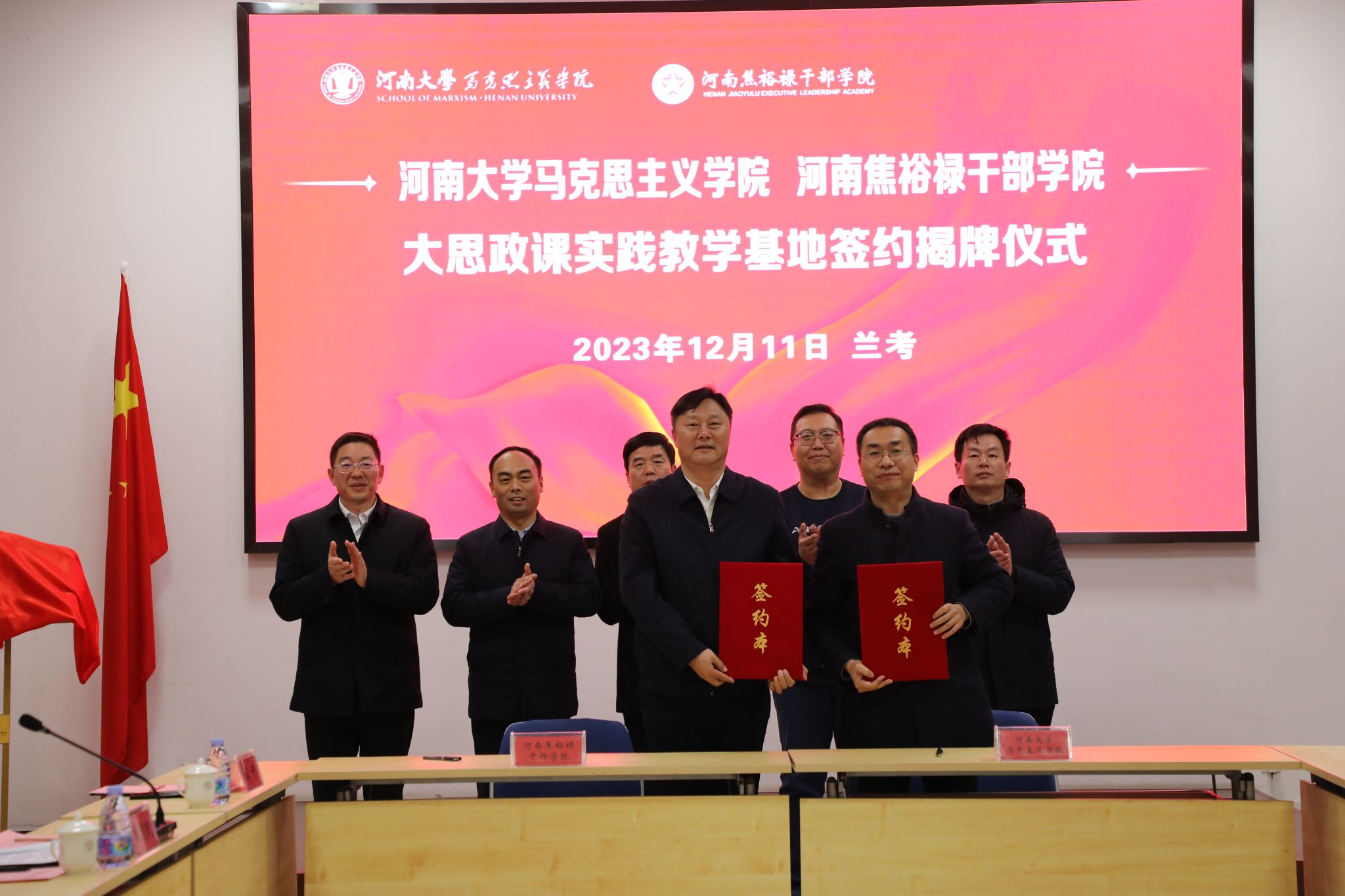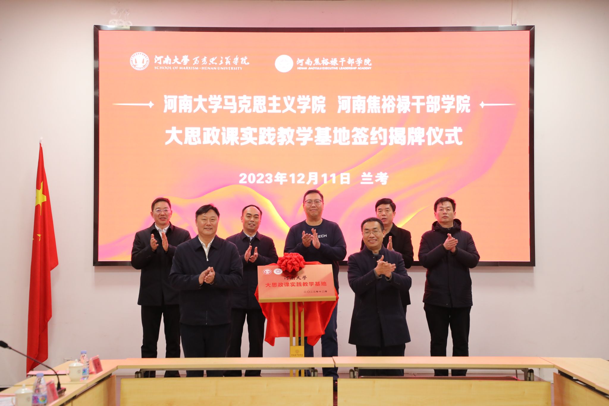 为深入贯彻党的二十大精神,积极落实《教育部办公厅关于组织开展高校与“大思政课”实践教学基地结对行动的通知》,扎实推进校地、校企、校校合作,世俱杯官方网站与河南焦裕禄干部学院共建“大思政课”实践教学基地签约揭牌仪式于12月11日在河南焦裕禄干部学院第一教学楼举行。世俱杯官方网站执行院长任东景、副院长刘嘉尧,河南焦裕禄干部学院党委副书记、常务副院长文柏松、副院长张连民、蔡治业、王开、王留群出席揭牌仪式。