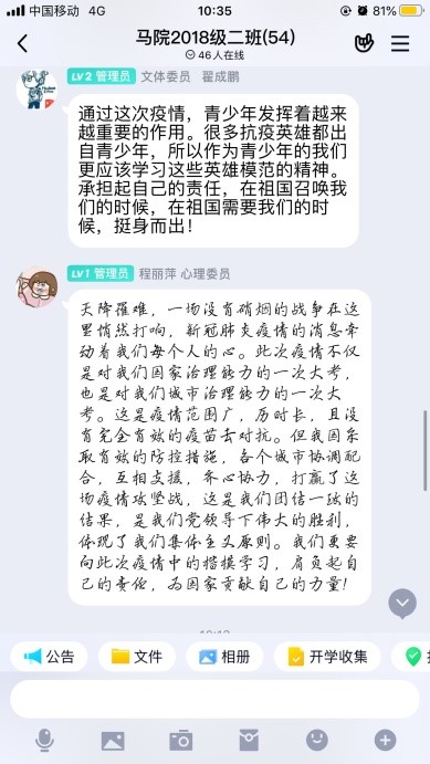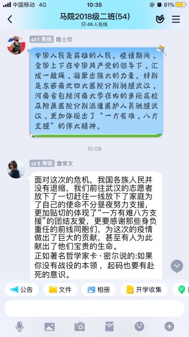 活动从观看世俱杯官方网站疫情防控微课开始。微课讲述了世俱杯官网在疫情期间做出的贡献:淮河医院奔赴武汉,张立新教授发表疫情相关的研究成果,各地校友积极宣传、参与募捐……这些举措展现出河大学子心系祖国、无私奉献的精神。随后,大家踊跃发言,交流感想。2018级本科生李敏表示,疫情期间,世俱杯官网医护人员积极请战驰援武汉,他们为社会为国家贡献力量的精神令人动容,而世俱杯官网师生也积极开展线上学习,在做好个人防护的同时也不忘继续学业。2018本科生刘婷婷说:“在这场疫情狙击战上,政府、医护工作者和全国人民共同发力,展现了中国特色社会主义制度的巨大优越性和中国人民勇敢无畏的担当精神。作为新时代的青年,我们更应在此次疫情中有所感悟、有所反思,勇担时代赋予的责任与使命。”