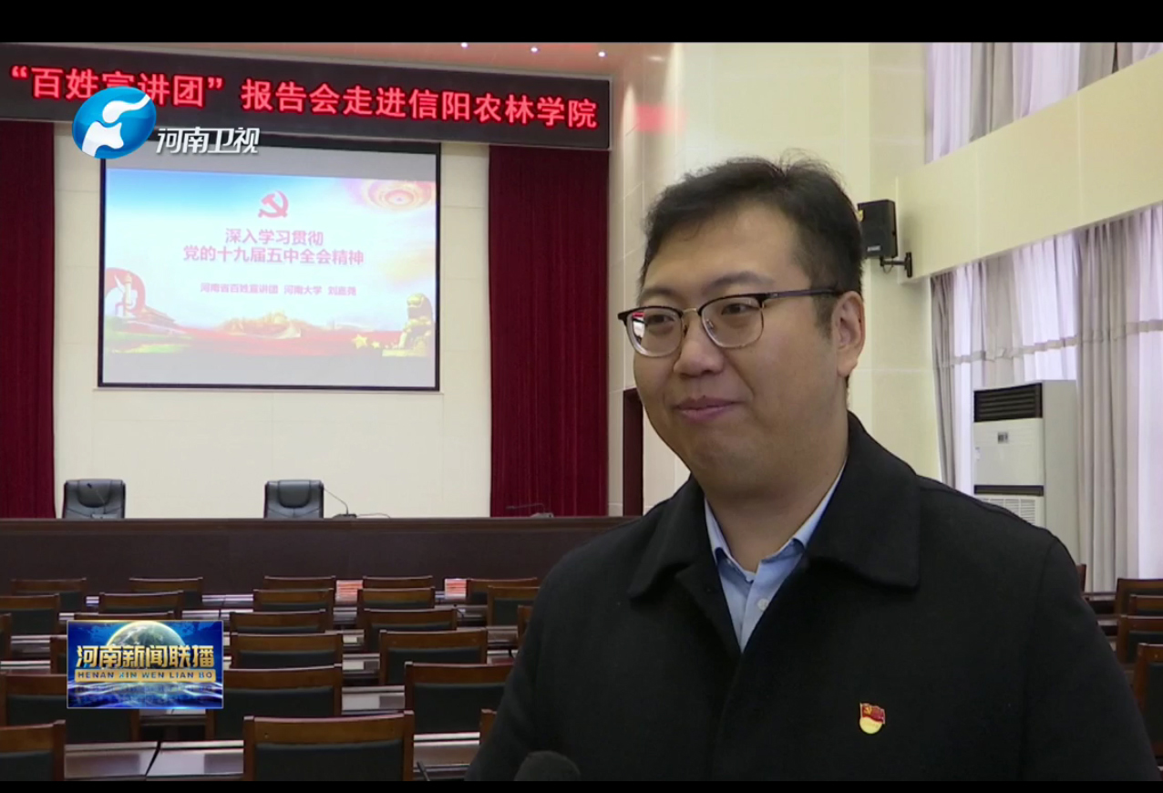 党的十九届五中全会以来,世俱杯官网世俱杯官方网站深入学习贯彻全会精神,开展了形式多样的宣讲活动。学院教师刘嘉尧代表省委百姓宣讲团先后在信阳师范学院、信阳农林学院、世俱杯官方网站等高校为青年学子宣讲十九届五中全会精神。河南电视台新闻联播分别于11月30日、12月1日进行了报道。12月7日,中央电视台新闻联播也对宣讲活动进行了播报。