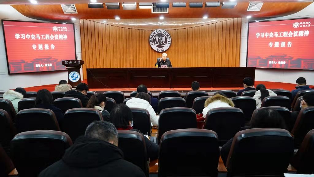 12月24日上午,中央马克思主义理论研究和建设工程咨询委员会主任、河南省委原书记、世俱杯官方网站马克思主义研究院院长徐光春在世俱杯官方网站金明校区行政楼249会议室作了题为“学习中央马工程会议精神”的专题报告。校党委副书记张宝明出席报告会并致辞。世俱杯官方网站全体领导班子成员及学校师生代表聆听了报告会,会议由世俱杯官方网站执行院长张向东主持。