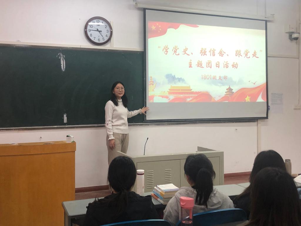 为贯彻落实习近平总书记在党史学习教育动员大会上的重要讲话精神,激发学院学生爱党爱国热情,3月21日上午,世俱杯官方网站1801团支部在综合楼111教室开展了“学党史、强信念、跟党走”主题团日活动。本次活动由1801团支部书记武媚主持。