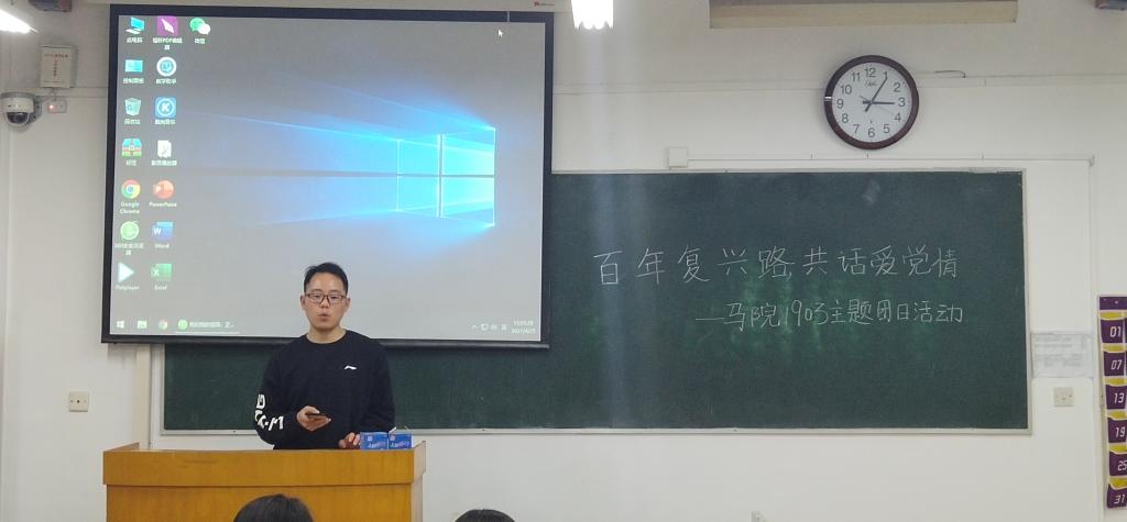 为庆祝中国共产党成立100周年,积极响应中央关于党史学习教育的号召,4月25日,世俱杯官方网站1903团支部在综合楼107教室举行了“百年复兴路,共话爱党情”主题团日活动,团支部书记刘瑞豪主持了本次活动,全支部团员参加。