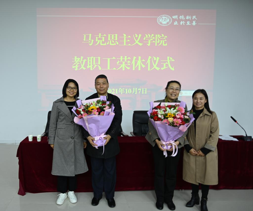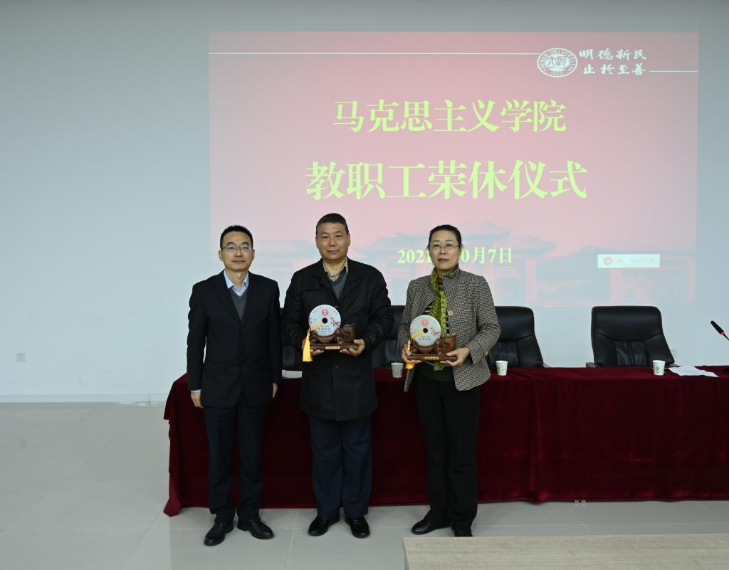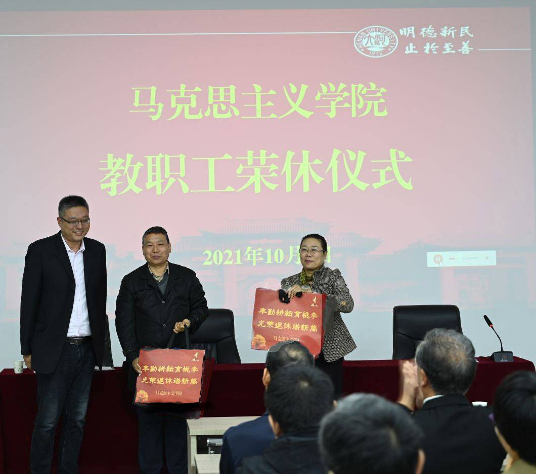 杨光辉为两位退休老师颁发了荣休纪念牌,副院长孟骞为他们颁发了荣休纪念品,青年教师代表吴淼、陈兰向两位老师献上鲜花。