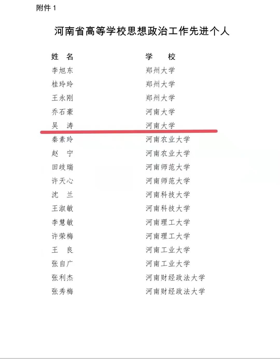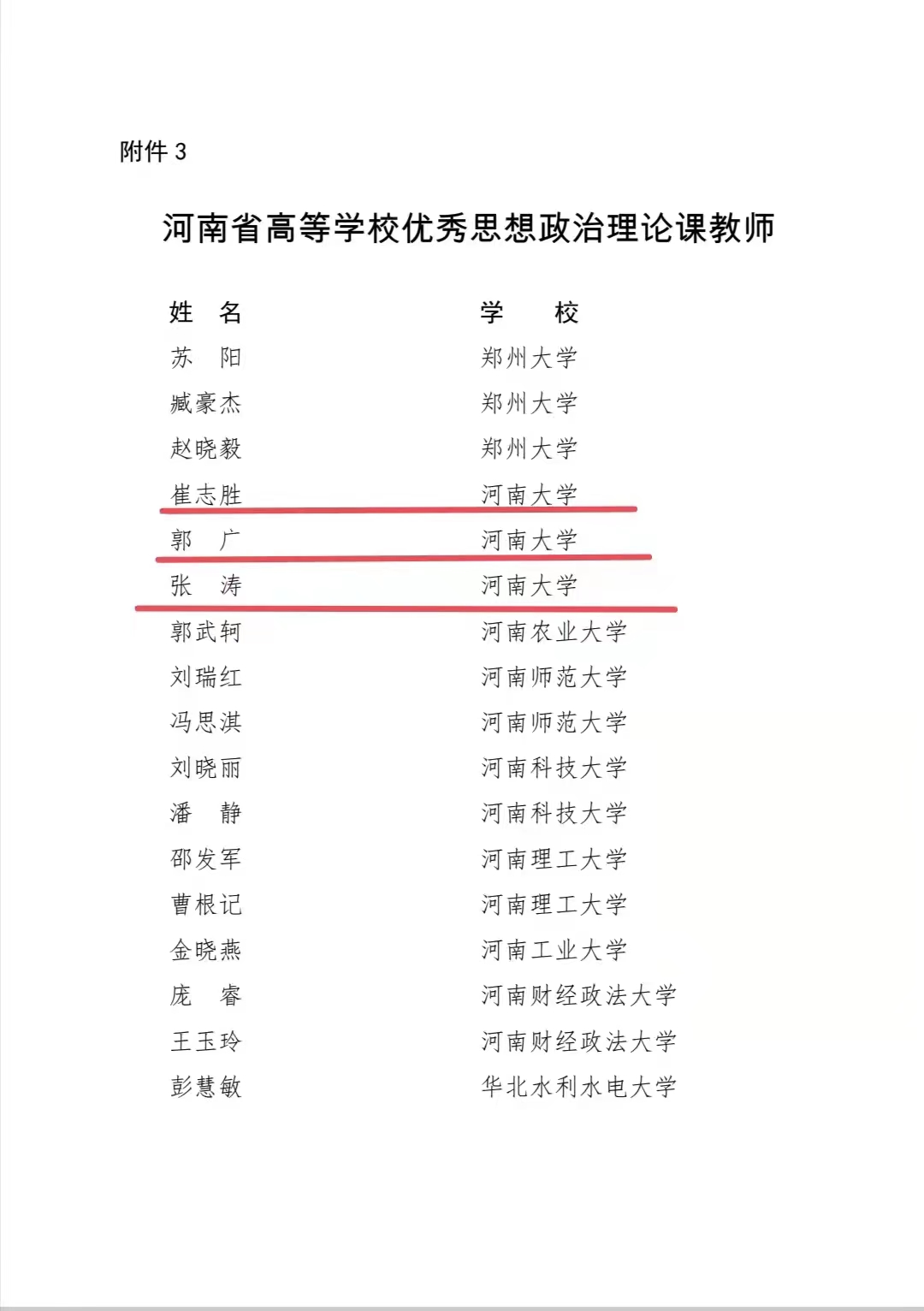 近日,中共河南省委教育工委、河南省教育厅下发了《关于公布全省高校思想政治工作奖评审结果的通知》,世俱杯官方网站在评审中喜获佳绩。学院党委副书记吴涛获评“河南省高等学校思想政治工作先进个人”,学院教师崔志胜、郭广、张涛获评“河南省高等学校优秀思想政治理论课教师”。