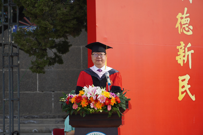 星河徜徉,一路有光。学院执行院长任东景代表学院向毕业生表示最热烈的祝贺,向辛勤培育的老师表示最诚挚的感谢。他表示,过去四年学院取得的历史性新成就是全院师生齐心协力、团结拼搏、接力奋斗的结果,向大家的辛勤付出表示感谢。最后,他向毕业生提出三点希望:一是希望同学们牢记校训院训,努力成为堪当民族复兴重任的时代新人;二是希望同学们与历史同向、与祖国同在、与人民同行,在青春的赛道上奋力奔跑出最好的成绩;三是希望同学们心有所畏、言有所戒、行有所止,积极投身崇德向善的道德实践,引领向上向善的社会风气和良好的社会风尚。