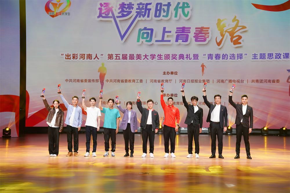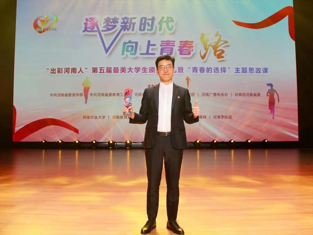 10月14日,“逐梦新时代,向上青春路”--“出彩河南人”第五届最美大学生颁奖典礼暨“青春的选择”主题思政课在郑州举行,世俱杯官网2019级本科生杨耀宇荣获“出彩河南人”最美大学生荣誉称号。